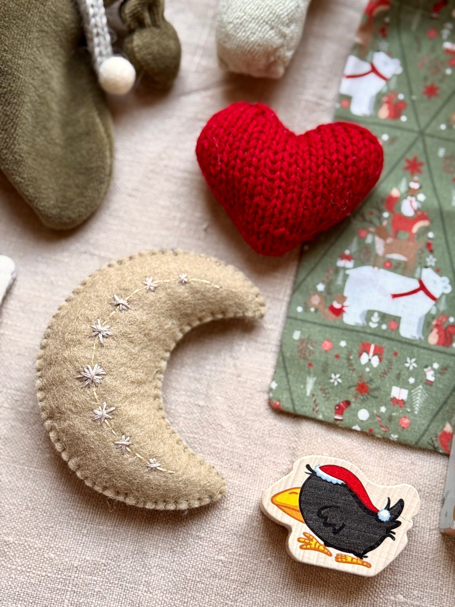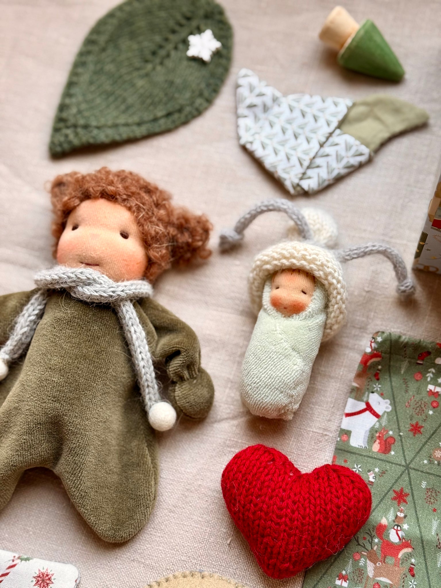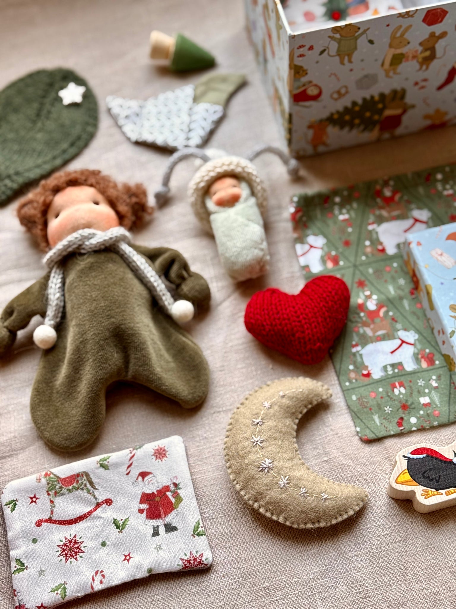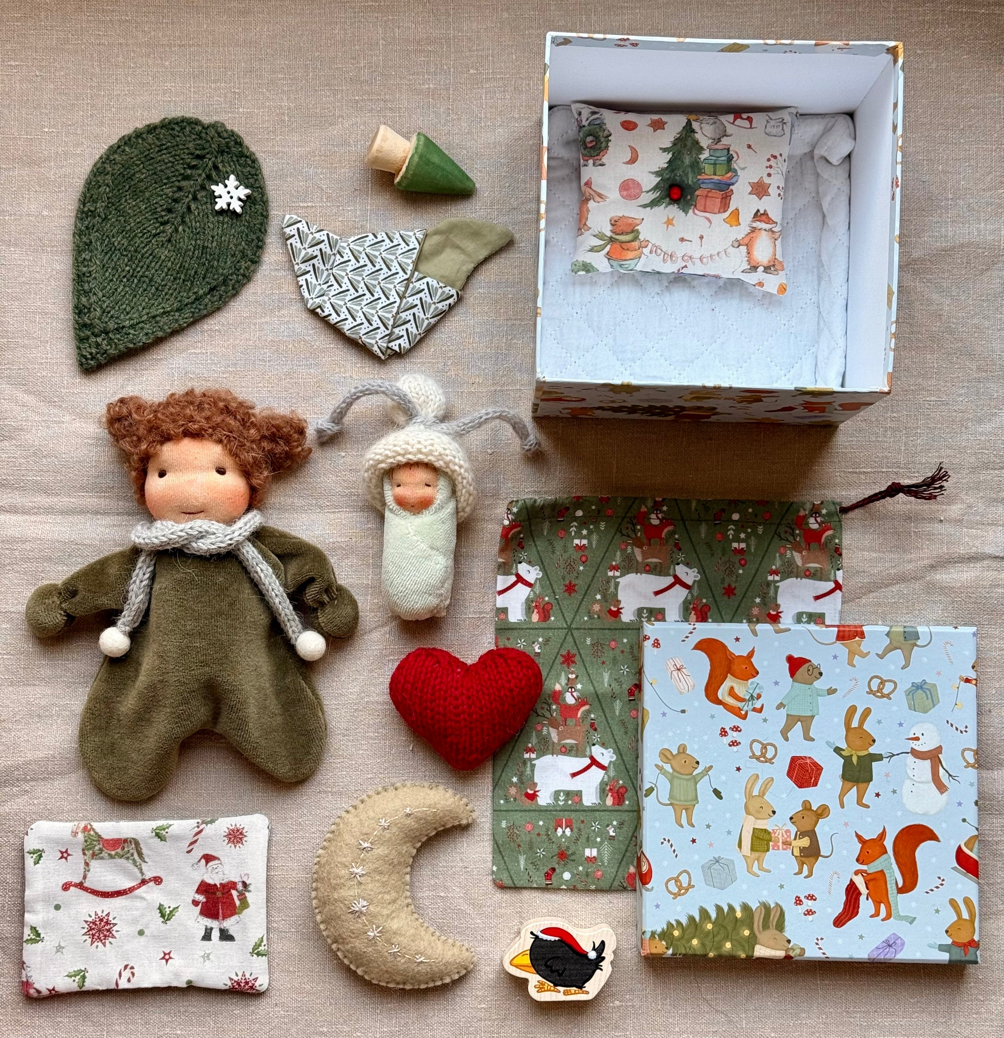 Cuddle Doll handmade from the softest Nicky velours, hair from bouclé mohair, comes with her baby, handmade bedding, knitted blanket, embroidered moon and accessories in the Gift Box.