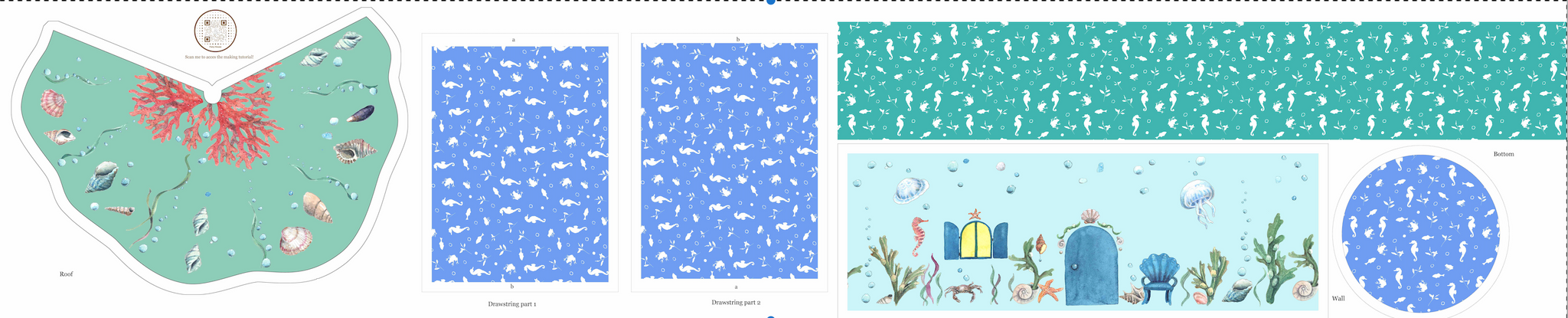 Premium organic cotton, pre washed, does not shrink, 158 cm wide, 152 gr. Ökotex certified, sustainably printed in Europe, available per meter, featuring 3 Mermaid House coupons per meter with QR labels for Tutorial PDF download.